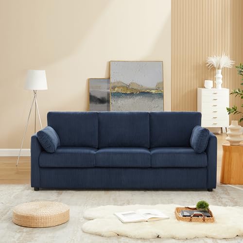 3 Seater Couches for Living Room, 79″ Modern Corduroy Sofa with 2 Pillows and Storage Pockets, Comfy Upholstered Couches for Apartment, Small Spaces, Home Office, Navy Blue.